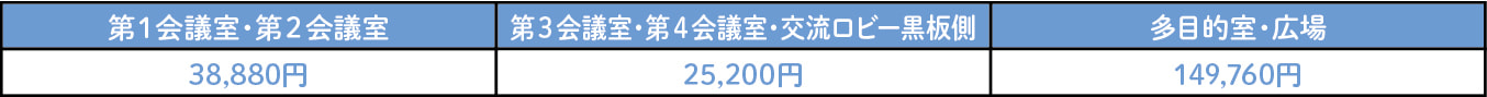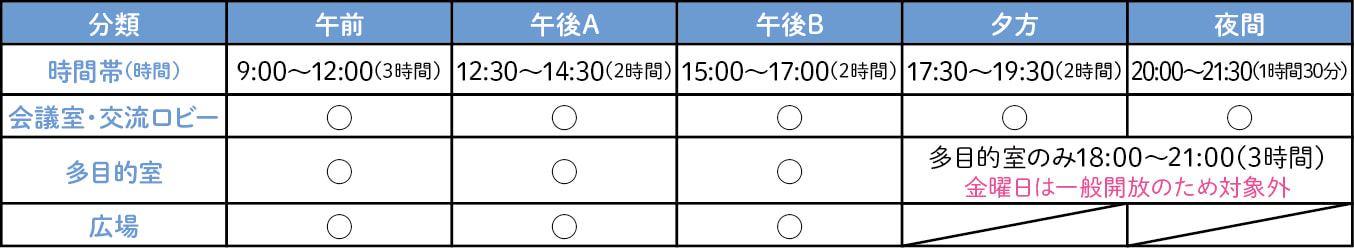 ・交流ロビー黒板側、会議室1~4…それぞれ4団体まで。