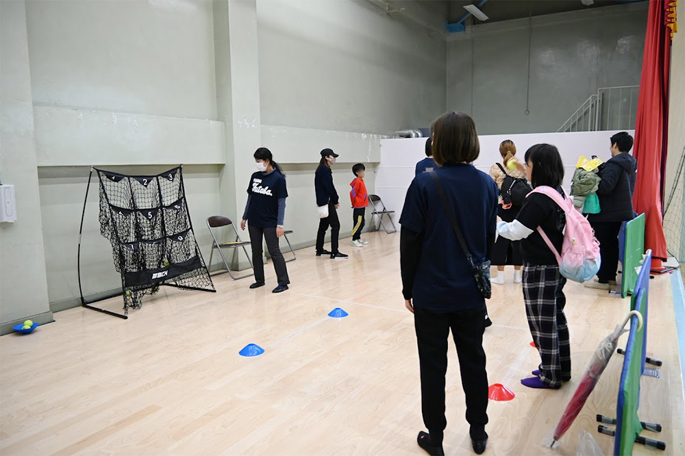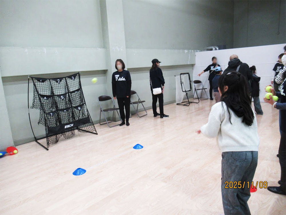 雨の中での開催となり体育館の舞台でやるのは初めてだったのでどんな感じになるか不安でした。セッティングしてみると上手くスペースを使う事が出来ました。野球を経験したこともない子たちもいたと思うので、これをきっかけに野球に興味を持ってくれればと思います。