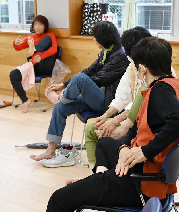 「ぎゃぁー」「痛たたたー」と悲鳴が響きました。外は小雨模様だったこともあり、部屋いっぱいに円陣を作り、椅子も足りなくなるほど。子供から年配の方まで幅広く参加されました。足もみで自分の健康は自分で作ることを、体験しながら感じ取り、痛さの後のスッキリ感を実感して頂けたと思います。