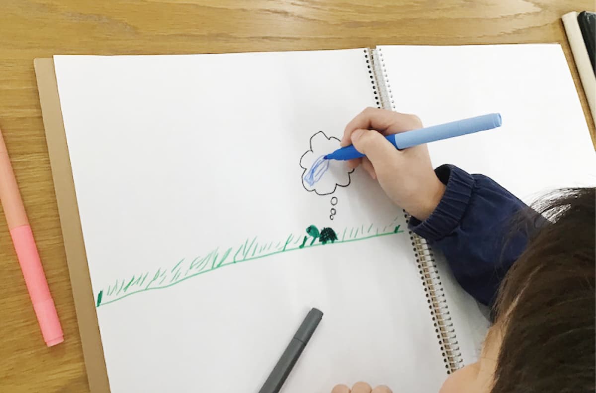 「どんぐり」は絵を描いて考える算数文章問題、「メディアリテラシー」は映像の撮影や編集。自分の頭で考える力を身につけます。