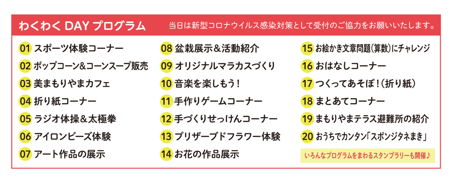 来たる11月5日にまもりやまテラスにて「わくわくDAY」を開催します。わくわくDAYは、新代田地域に住む人々、地域の団体、テラスで活動をするグループがさまざまな企画を行う一年に一度のイベントです。テラスでイベントを実施するのは2019年のオープニングイベント以来となります。