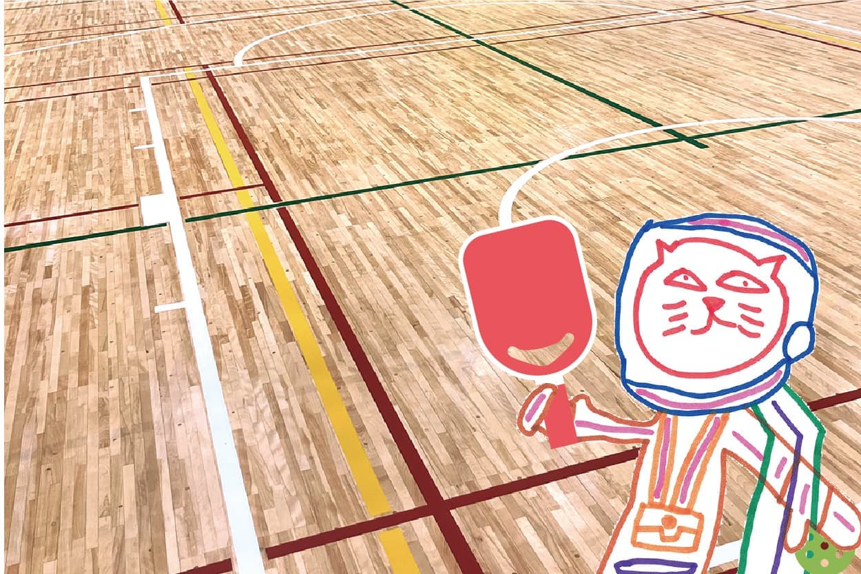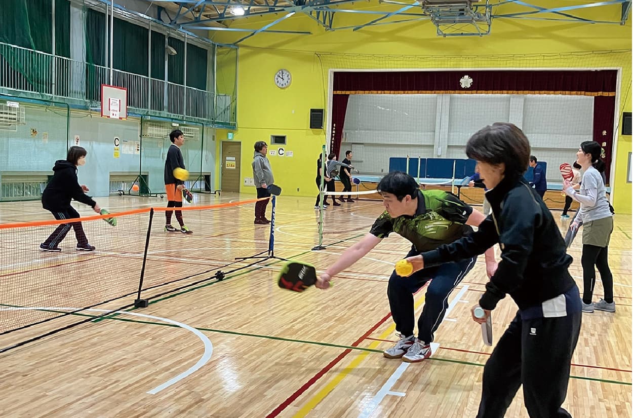 ピックルボールは、ラリーの持続性や安全性を高めるため、ボレーを禁止するノンボレーライン(写真の黄色のライン)を設けています。これが引いてある体育館は、全国で唯一、まもりやまテラスだけなんです(本誌発行時点)。ここならでの最高の環境でピックルボールを体験できます。
