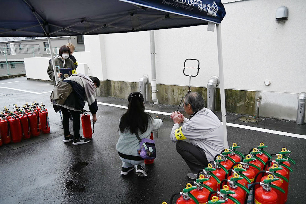 雨天で煙中訓練は出来ませんでしたが、受付訓練、消火器訓練にたくさんの方に参加していただきました!消防署の方にご協力いただいたAED・心臓マッサージ訓練コーナーも好評でした!地域の防災力向上のために次回も是非とも参加させていただきたいです。
