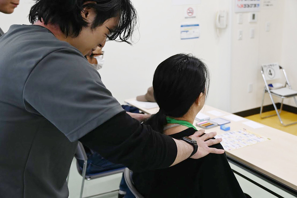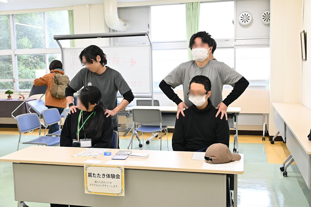 肩たたき体験として参加しました。お子さんには肩たたき券作りとコツを伝え、楽しそうに実践する姿がとても印象的でした。親御さんからも喜びの声をいただき、空き時間には大人の方にも体験していただくことで、日頃の疲れを癒すひとときになったと思います。